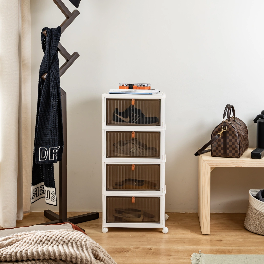 Discover the HOUZE DROPBOXX. your ideal shoe storage solution! Compact and foldable. this single or multi-tier cabinet is made from durable materials. keeping your shoes safe from dust and moisture. Its magnetic latch and semi-transparent door make it a breeze to use. Plus. its wheels make moving around easy. Perfect for any modern Singapore home. the SoleMate is stylish and practical!