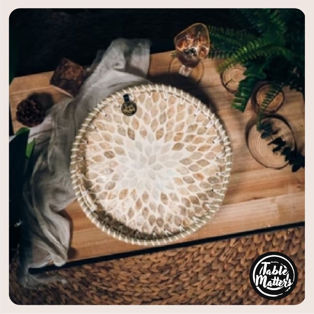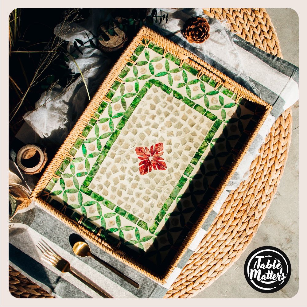 Discover the epitome of elegance intertwined with a conscience for sustainability with Table Matters’ ORNATE Midnight Guppy Rattan Serving Tray (Large). It is a piece that doesn’t just sit on your table but enchants your evenings. turning ordinary nights into a tapestry of memorable moments. Meticulously crafted from the sustainable embrace of Rattan and Shell. this serving tray is not just an object but a commitment to our planet. Its generous dimensions. 36cm by 26cm. are perfectly poised to host a delightful array of beverages and snacks. ensuring you are always in good company.
