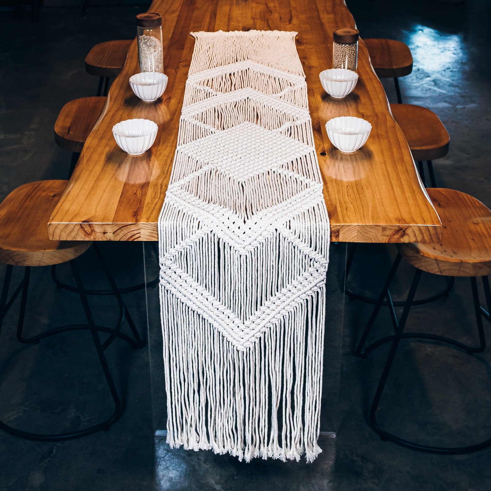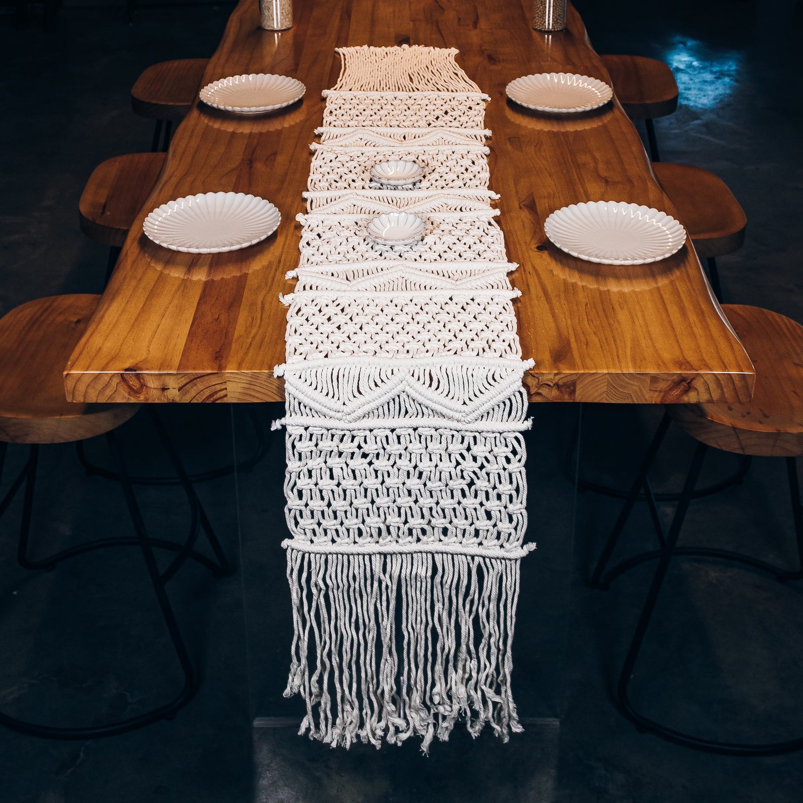It features an elaborate harmony of various designs with thick borders creating framed diamond-shaped patterns in the middle. Being the centre of attention to many. Uplifting the pattern further is its honeycomb-like Bricohe stitch that connects both patterns together. Made from cotton. these runners are soft and adds a new texture to your tables. Handwoven down to the smallest details with numerous textures and techniques used. Perfect in accompanying the Boho aesthetic it is a simple yet beauteous addition that highlights any kind of table setting.